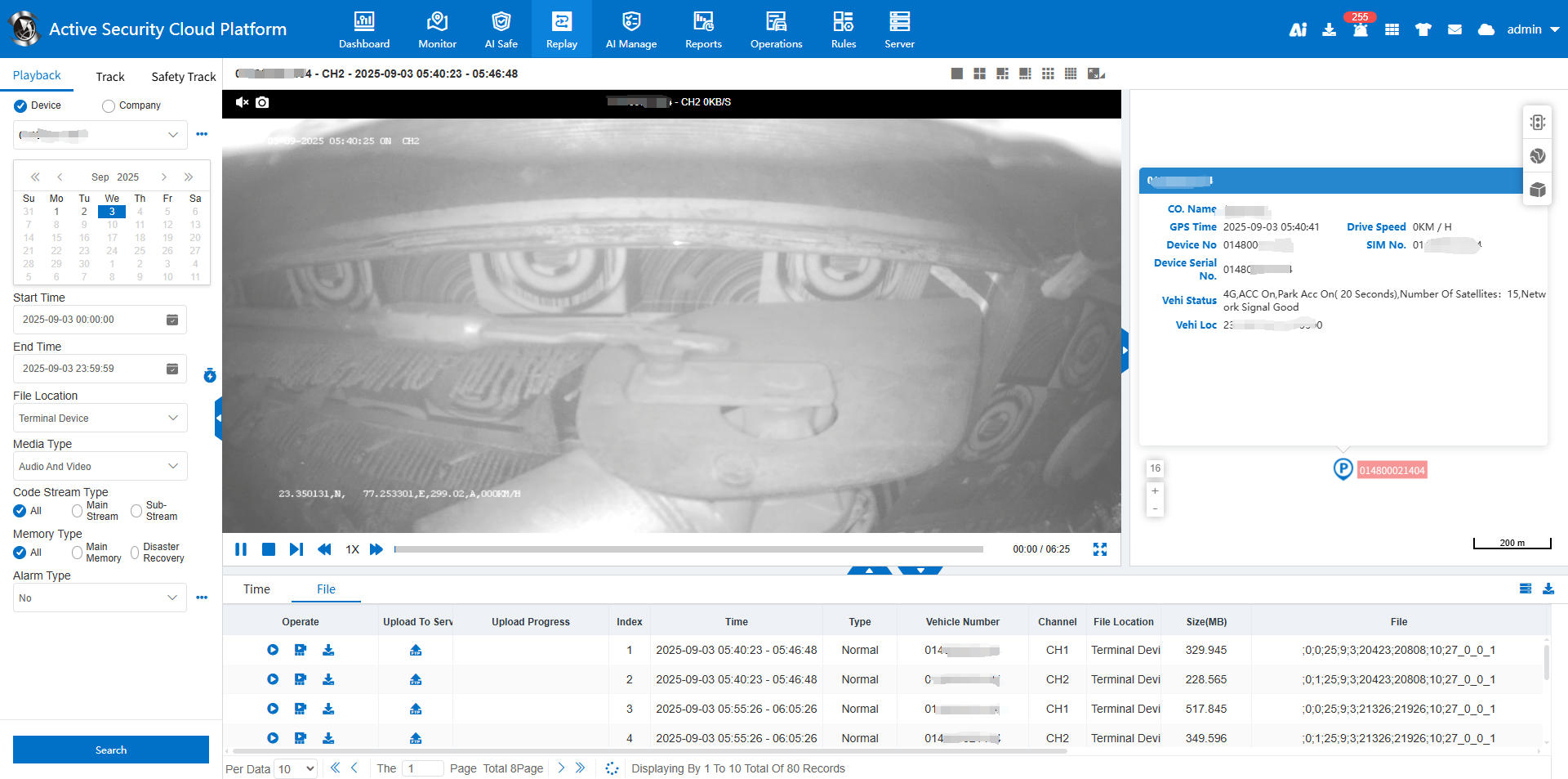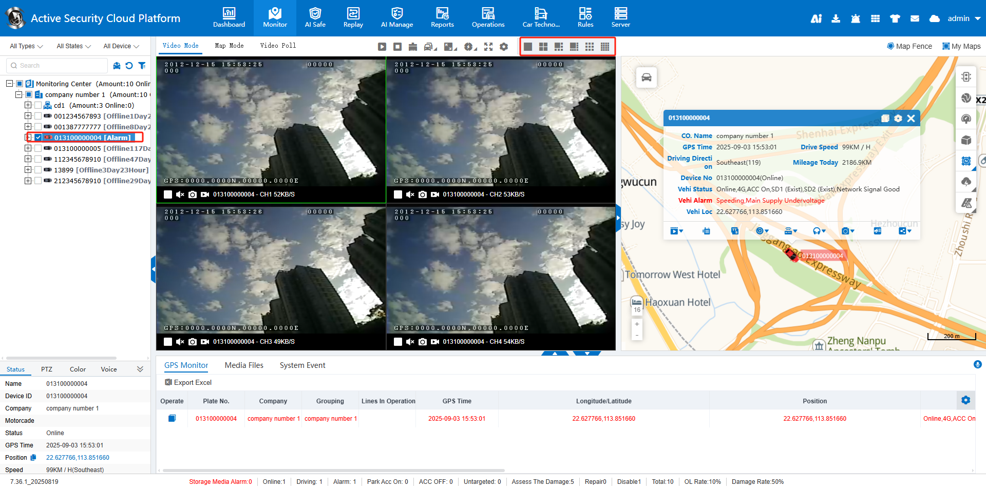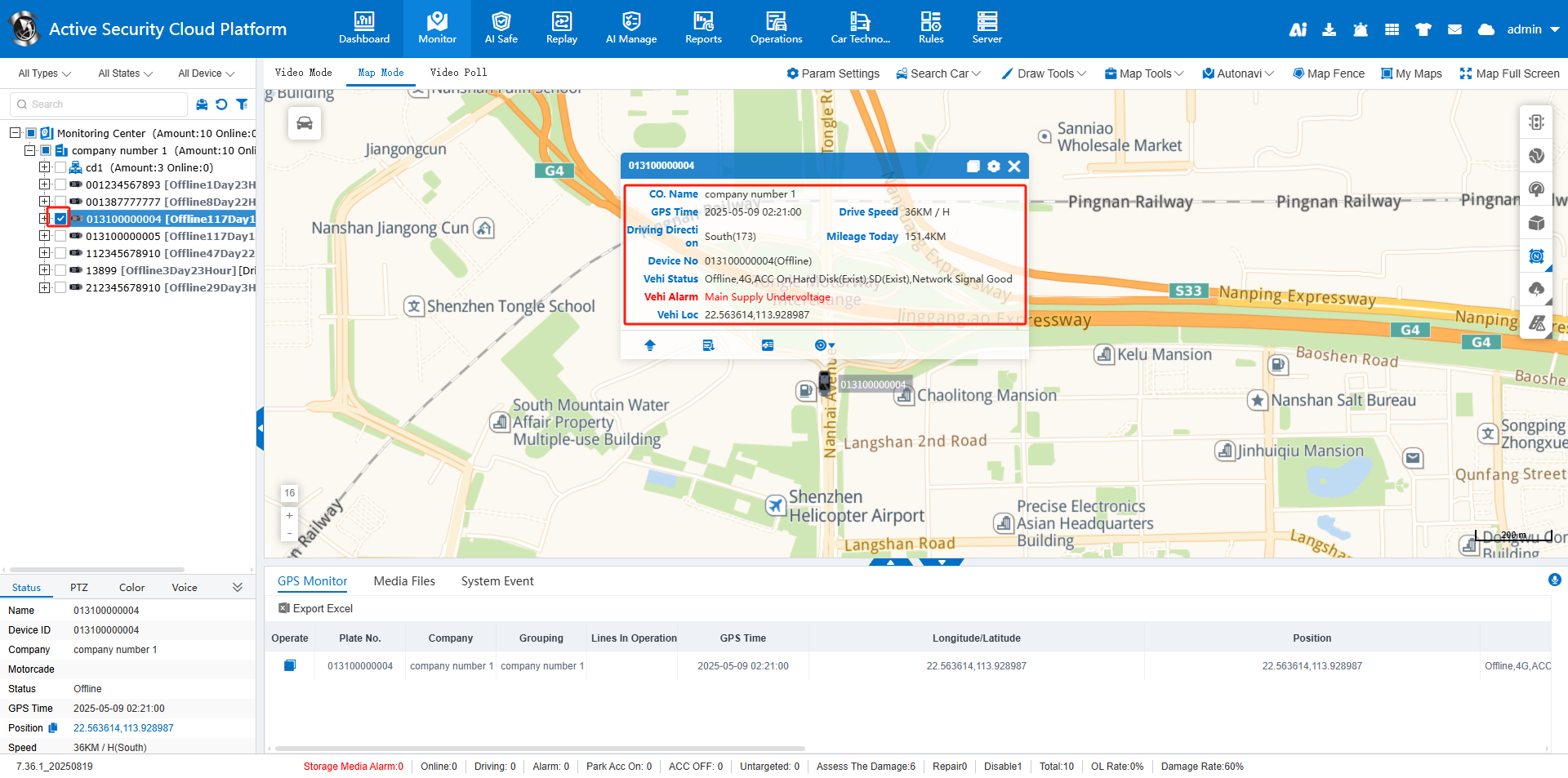 a. Go to Real-Time Monitoring > Map Mode. In the vehicle list on the left, check the box next to the license plate number to display the vehicle’s real-time position on the map.