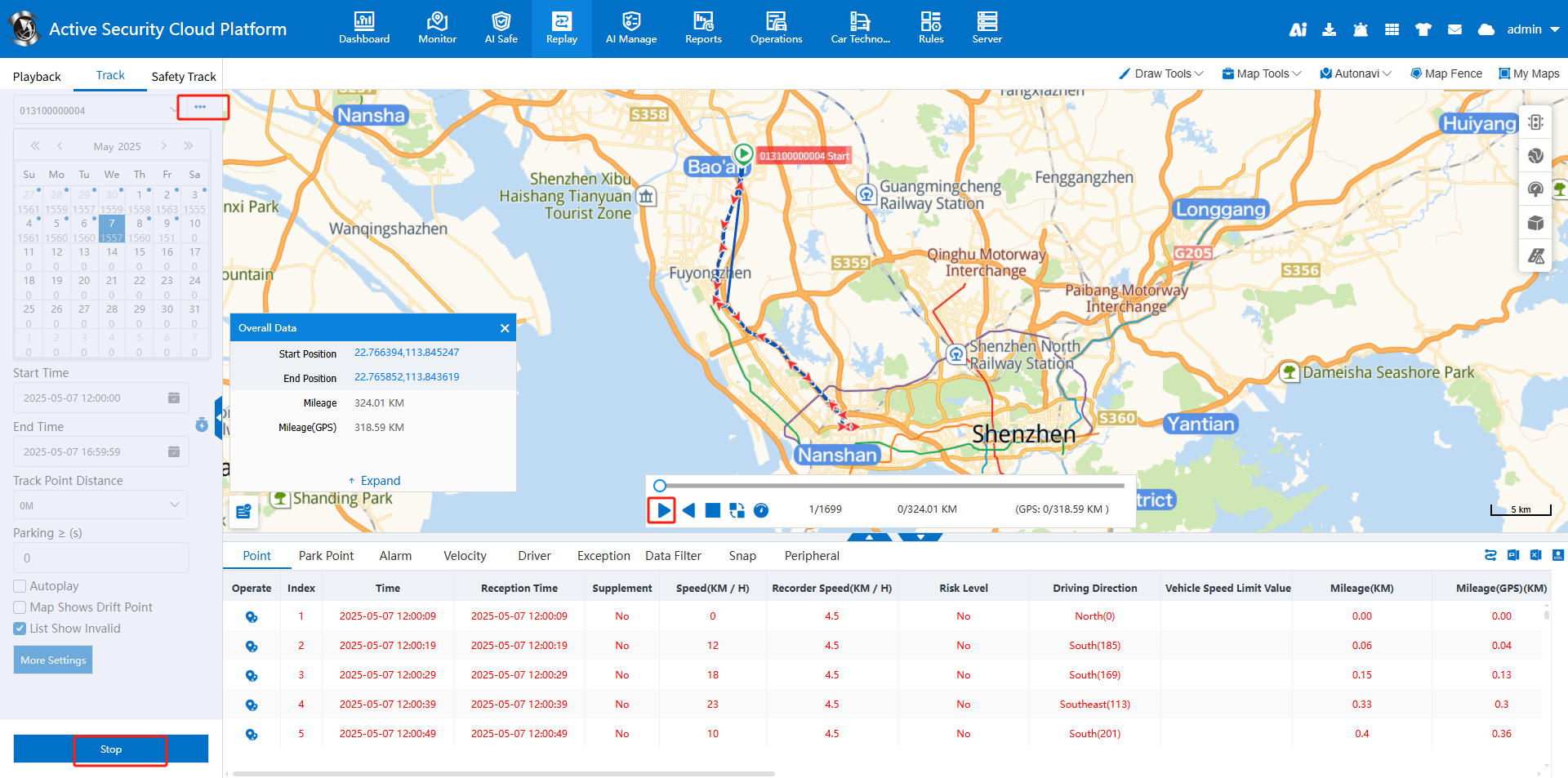 c. Click [Play] to start trajectory playback. Trajectory data can be exported in Excel or PDF format.
