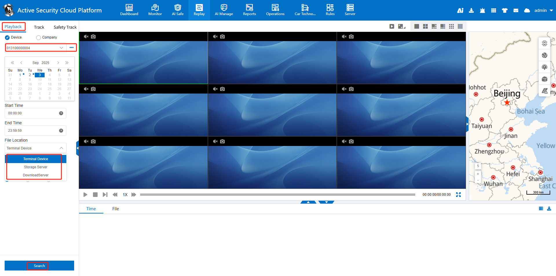 b. Select the target vehicle, date, and time range. Choose the file location from the options: Terminal Device, Storage Server, or Download Server.